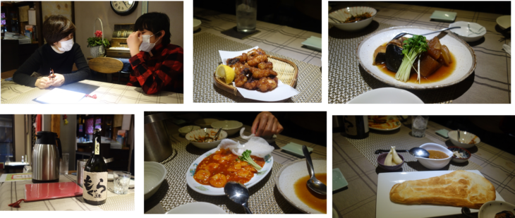 いろり茶屋を想定していましたが、お昼のワカサギと被るという律子さんの意見もあり、夕食も2日連続で近所の「花采」にしました。案内されたお席も昨日と同じ。先客のお客様4組で忙しそうでした。
