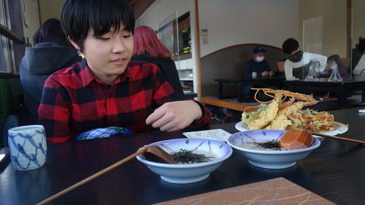 12時にトシ君を仙石原星の王子様ミュージアムバス停前でピックアップ。昨日と同じ芦ノ湖の網元「うえ乃」でお昼ご飯、天婦羅盛り合わせ・トロロ・ワカサギ定食を注文。我々は2日連続となりました。