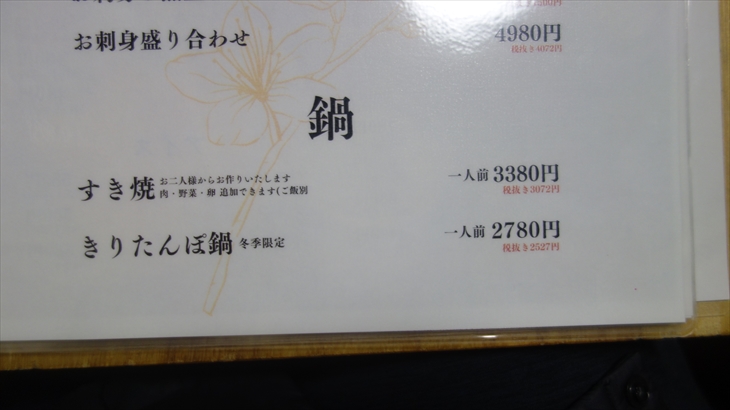 また、壁に掲載されているきりたんぽ鍋の価格(2260円)とメニュー表示価格(2780円)との違いについて質問したところ「メニュー表示が正しいです」とアルバイトの方が回答。