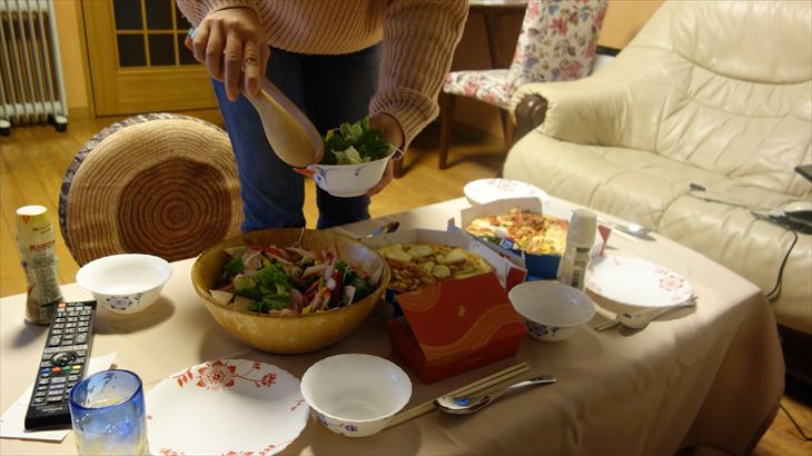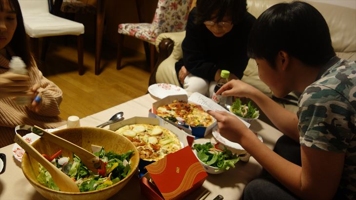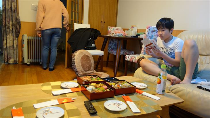 お昼ご飯は食べなかったので初詣の帰り道ではお腹がすいたようです。デリバリPIZZAとおせち完食、その後カレーと炒めた牛肉で早めの夕食終了しました。