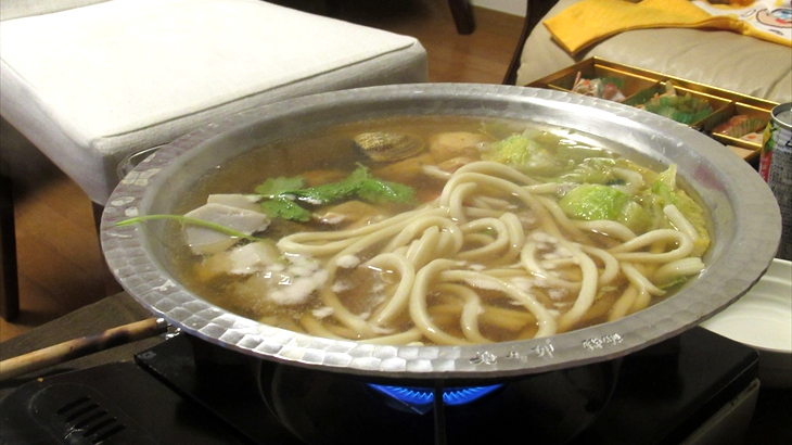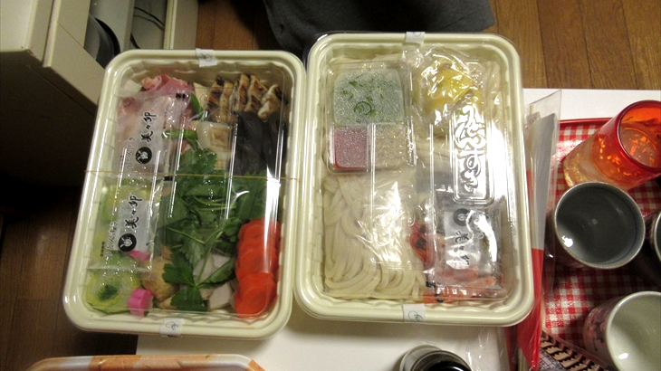 夕食は大晦日のメンパーで我が家で食事。デパートの様子を探りながら横浜そごうの美々卯でうどんすきセットを購入、焼肉用のお肉とデザートのロールケーキを準備して夕食に備えました。