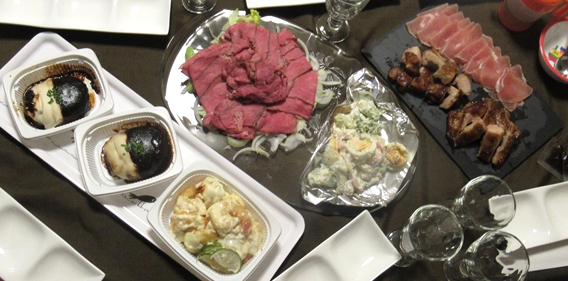 イオンの五島塩ローストビーフ、海老マヨ、サラダ、生ハム盛り合わせ、照り焼きチキンなど豪華版。