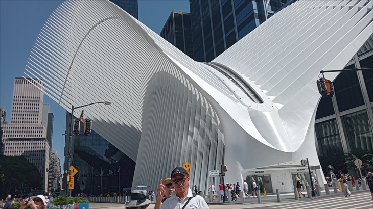 グランドゼロを目指し歩くと、鳩(鶴かも)が翼を広げ平和のシンボルとされる特徴的な白い建物はWorld Trade Center駅、店舗、大きな空間を有するを複合施設です。