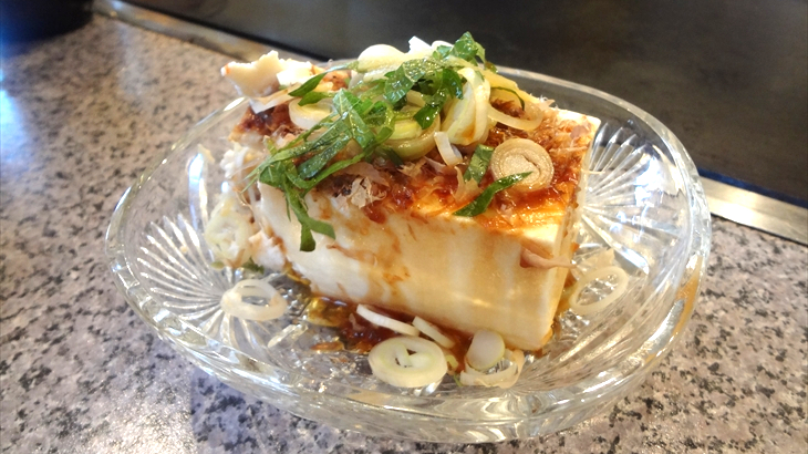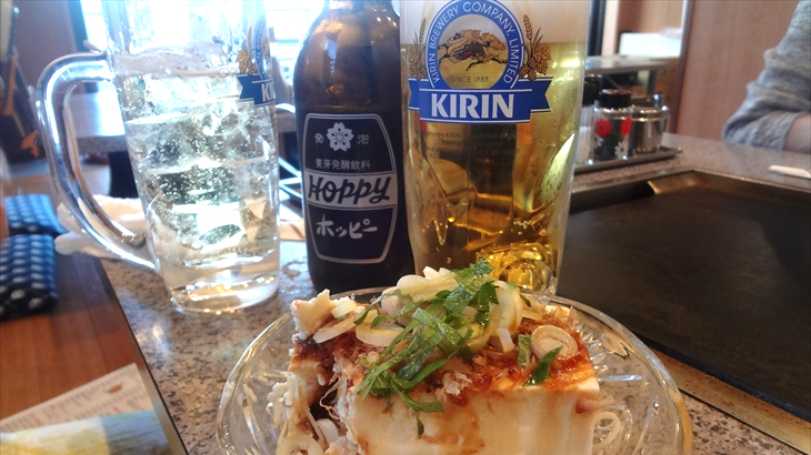 お好み焼きを開始する前に冷奴で一杯。豚たまお好み焼きと五目焼きそばを注文、焼き物はお頼みすればお店の方が焼き方をレクチャー、焼いてくれるようですが、基本は自分で焼くのがこのお店のスタイルです。