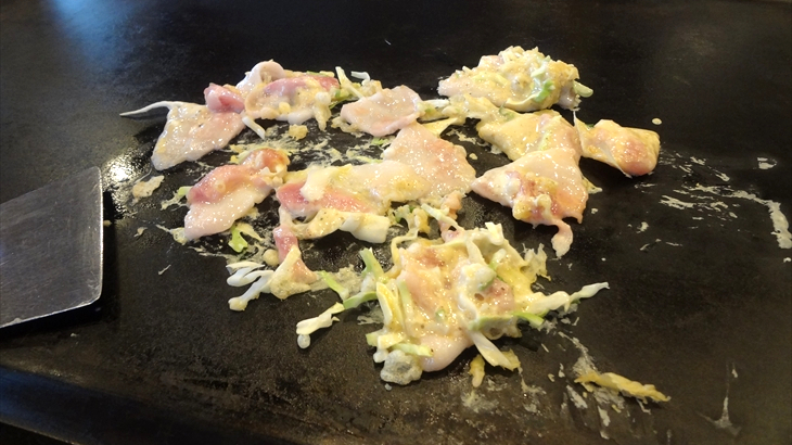 お好み焼きの具が入ったボールが来たので、全部混ぜていると、豚肉は最初に焼くものだとの指摘があり、まぜこぜにしたボールから豚肉を取り出し個別に焼きましたが、お肉のカリカリ感は投入失敗で味わえませんでした。焼きそばは普通。