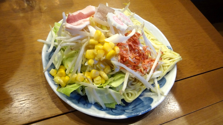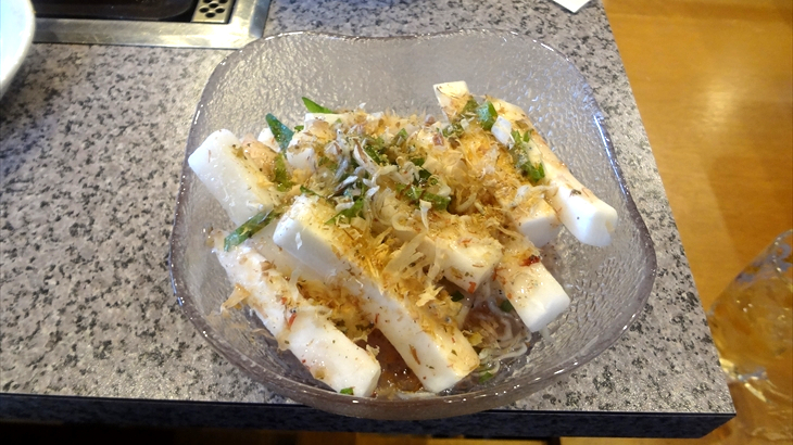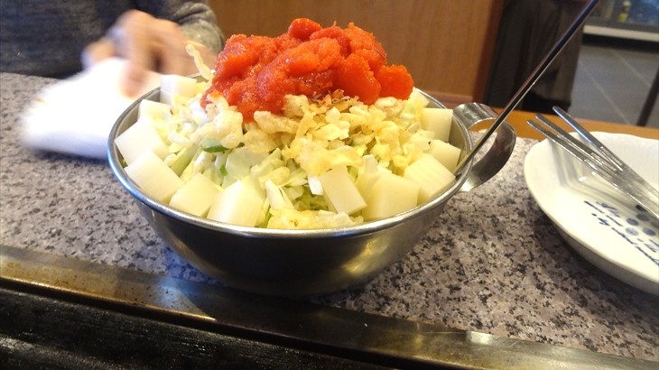 ひと通り食べた後、ホッピーのお代わりと大根サラダ、もんじゃ焼きを注文。もんじゃ焼きは野菜で土手を作り、真ん中に小麦粉を溶かしたルーを注入し、小さなヘラで焦げ目をつけながら頂くのが定番ですが、これもまたパリパリを実感できません。