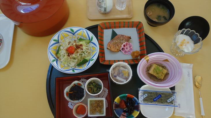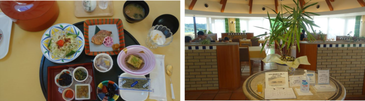 朝散歩のとき駐車場の車は6台、朝食会場では6卓が準備されていたので、今回の宿泊者は6組だと思います。私以外は家族で利用していました。食は7:30から、美味しく頂きました。
