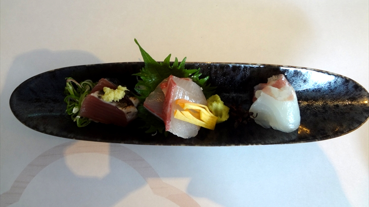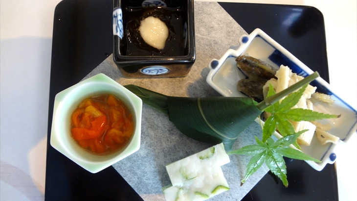 食事が始まりました。カニと青物の小鉢の後は、一皿に5点綺麗に盛られた前菜、真ん中の笹の中に入っていいたのは一口鮨でした。