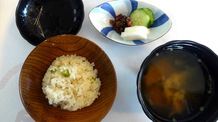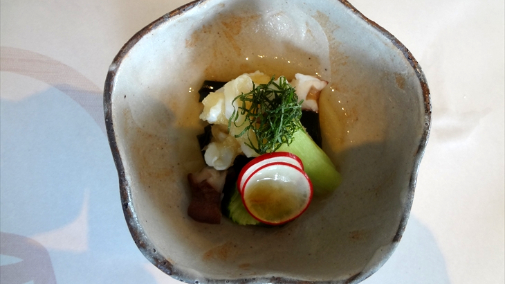 箸休めにタコと青物の酢の小鉢。最後に豆ごはん、味噌汁、お漬物。ゴマ豆腐みたいな触感のデザートが出ました。お酒を楽しみながらゆっくりと食事ができ、お腹一杯になりました。