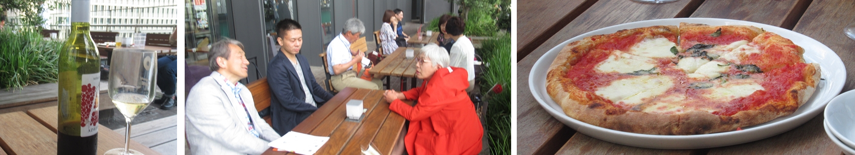 ワイン片手にピザ、心地よいテラス席、ナイスな景色は2次会の場所として最高。