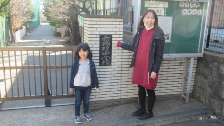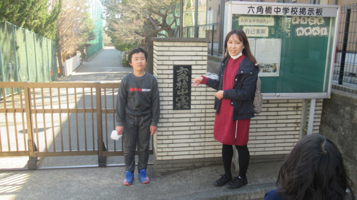 長女宅に全員集合、そこからGoogleMAPの道案内で六角橋中学校まで散歩開始。GoogleMAPだと最短距離は1.3km(徒歩18分)、わかり易い大きな道路を通ると2.2km(徒歩30分)、ゆっくり歩いたので20分ほどで裏門に到着しました。