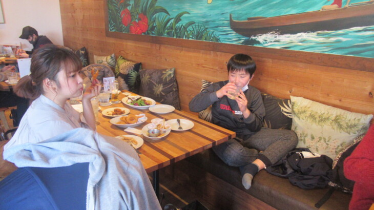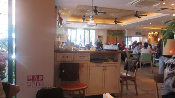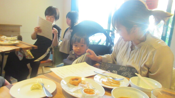 お昼ご飯はパンケーキで有名な岸根公園メレンゲ。六角橋中学校から移動中にベビーカーの中で利太朗くんは寝てしましました。到着した12:50頃は満席、約10分ほど待って案内されたのは一番奥の2つのテーブル席、落ち着けました。