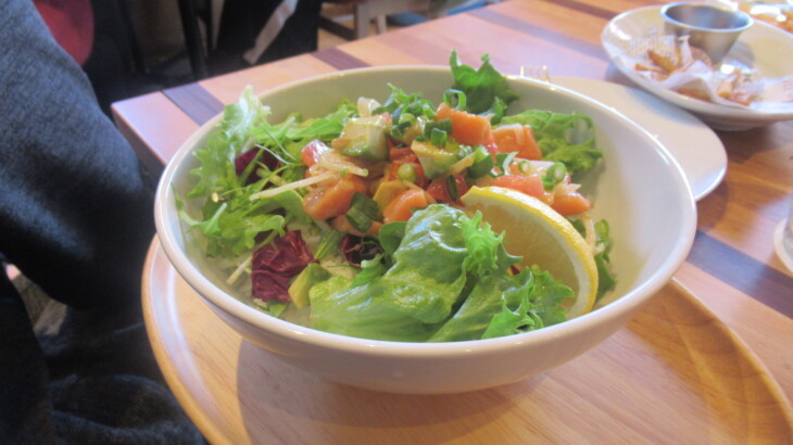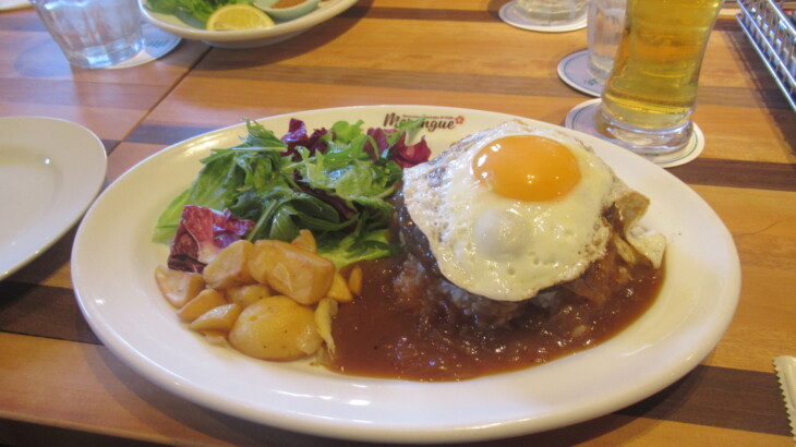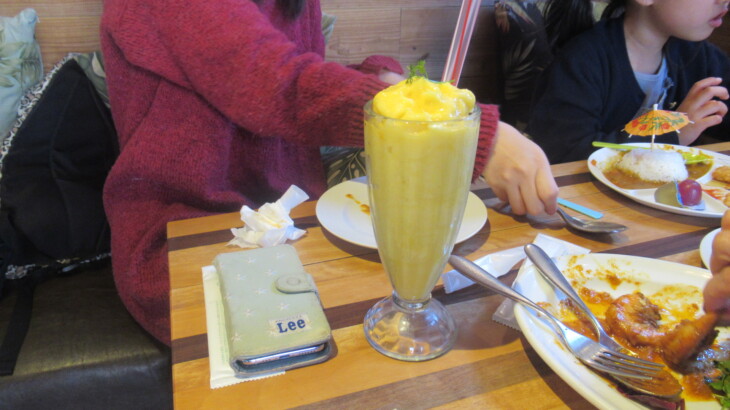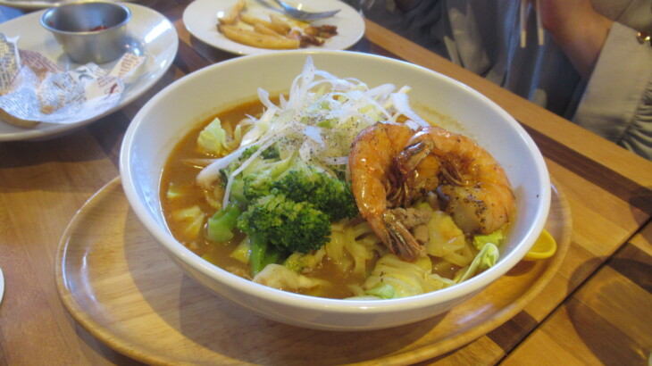 1時間飲み放題(アルコール含む)880円のメニューにそそられ注文、アルコール類は280円と単価安いので単品で良いとのご意見もあり。最初にアヤちゃん用の子供カレー、ポテトフライ・ガーリックシュリンプ・ロコモコ(私)・イカリングフライ・野菜中心の丼(トシ君)・海老ラーメン・ワンタンなどを注文。
