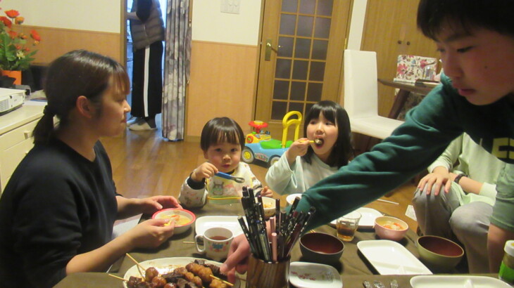 焼き鳥を買ってきて自宅で夕食。子供達に大人気、特につくね。お味噌汁も少し甘くて美味しかったです。