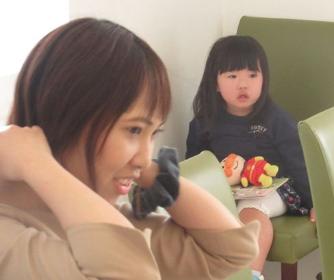 道路に座り込んだ2歳の孫はまだ会合に馴染めません。後ろに椅子を置いて1人で座らせておくことにしました。