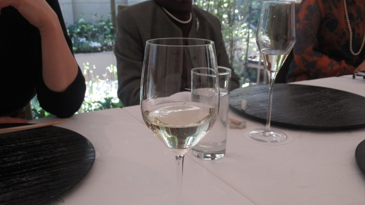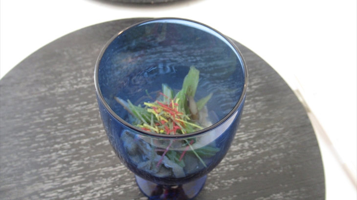 テーブルの上には黒色の円形お盆の上に白いナプキンと朱色の盃が裏返しに準備されていました。食事の前にチョッピリの桜湯、盃に注がれた祝い酒、そしてシャンパンで乾杯♪♪