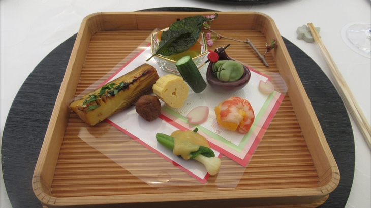 還暦を迎えた義弟の挨拶がありお祝いの会がはじまりました。青のグラスに盛り付けられた先附、湯葉の椀物、食用花で彩られた旬の逸品、桜の小枝で飾られた八寸などの京料理を頂き、途中で恒例の赤いチャンチャンコを羽織ってもらい、本日のプレゼントタイムです。