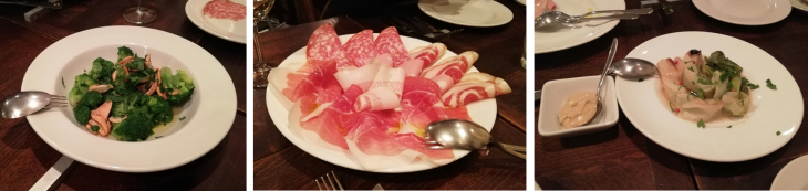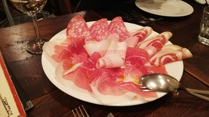 まづは白ワインボトル。最初にお願いした生ハムとサラミ盛り合わせはボリュームたっぷりでビックリ!