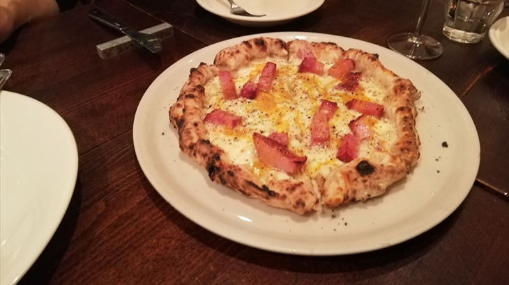 オーナーシェフが修行を積んだ本場仕込みの窯焼きピザで有名になったお店、ピザは欠かせません。選んだピザはグラタンピザ、3種チーズの蜂蜜添えピザ、マルゲリータの3種類。ワインボトルも3本目、3名で3本は飲みすぎです・・・・