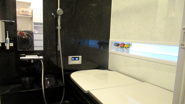 黒を基調としたユニットバスと細長い窓の確認はTOTOのショールームへ行かないとイメージが湧かなかったと思います。