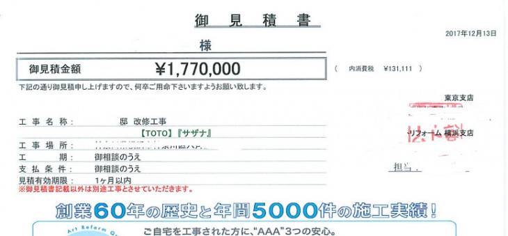 リフォーム会社を決めたのが12月13日、まづは先行して12月20日頃に給湯器を交換。やっと自宅でお風呂が入れるようになりました。給湯器の交換費用は23万円、これは年内にお支払しました。