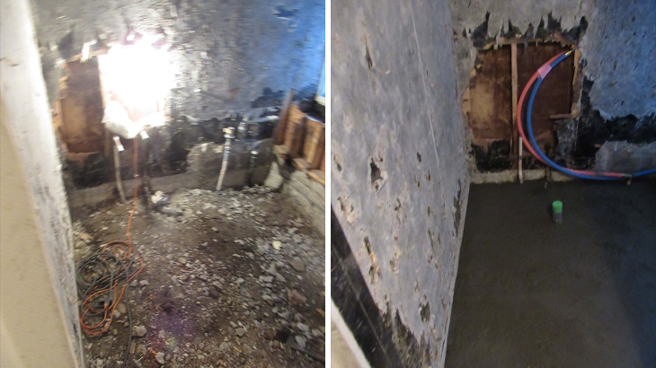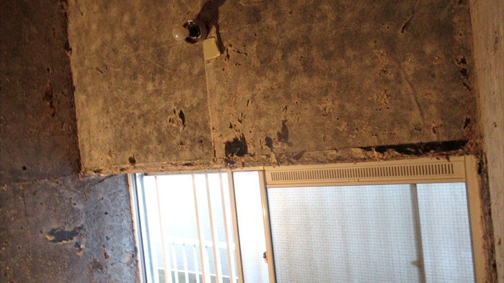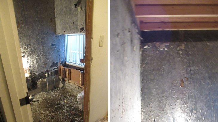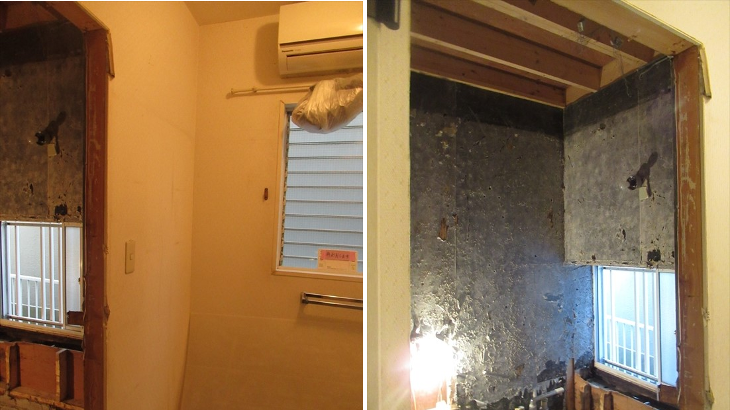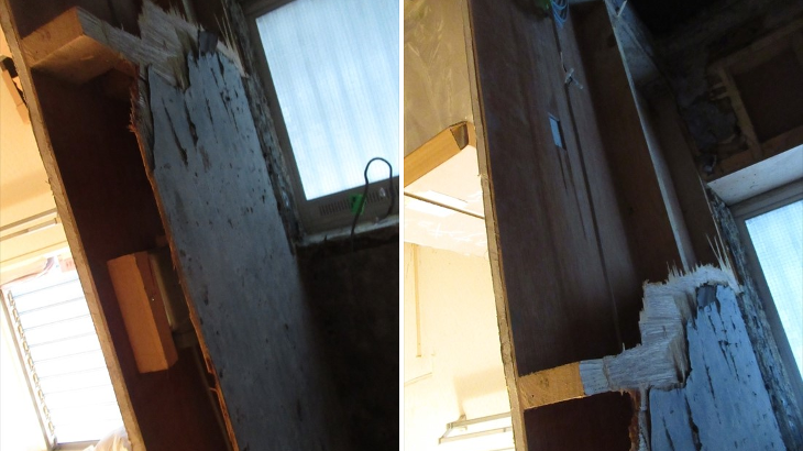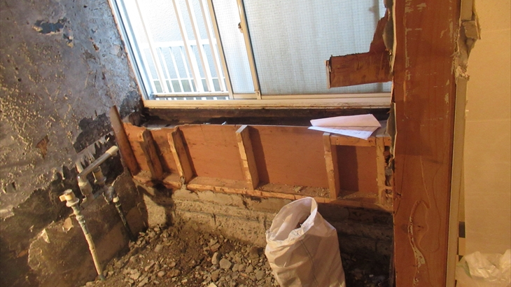 初日の工事はタイルの解体。音とホコリがかなり発生、夕方解体がほぼ完了しましたが問題発生。既存出窓下の構造材の腐食とお風呂・洗面所の仕切りの下にある基礎の上の構造材も腐食があり補強追加工事が必要になるとのこと。