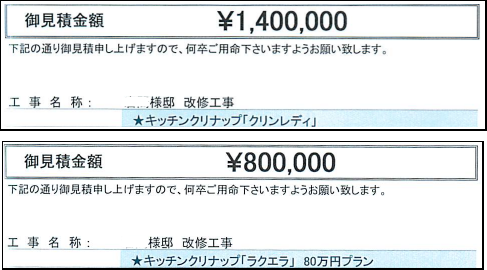 予算オーバなので合理化しなければなりません。製品をラクエラベース・IHコンロを両面グリル式ガスコンロ(クリナップ)に変更、そして洗面台を追加した場合の見積をもらいました。