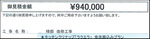 商品によってだいぶ価格が変わるので80万円のラクエラに食洗機をオプション追加してもらった見積を3月4日に頂きました。