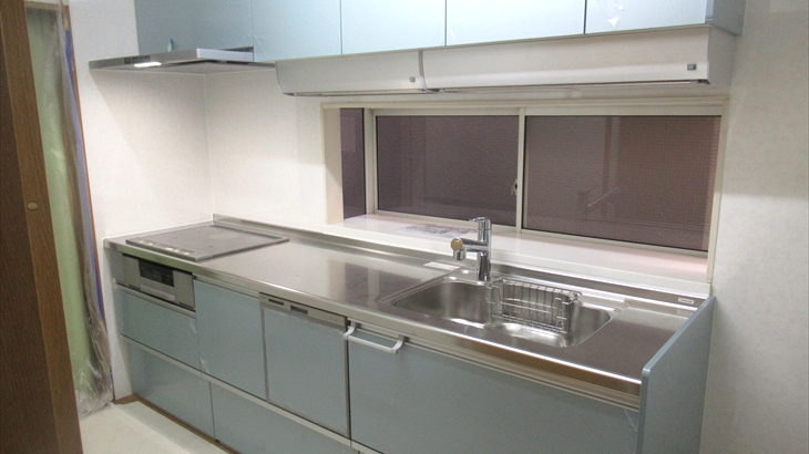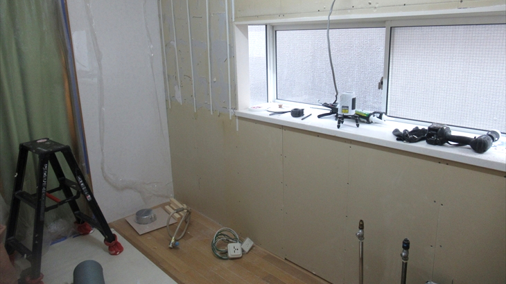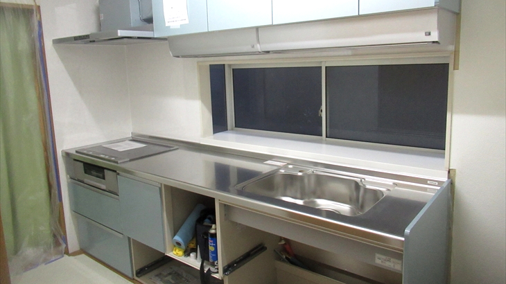 既存キッチンの解体・搬出、新キッチンの搬入し5割くらい組立(水廻りの接続も完了)。