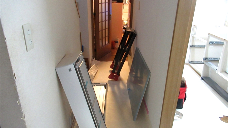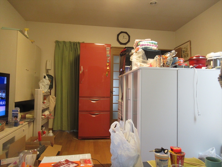 9月20日の既存キッチン解体に向け、既存キッチン内・隙間家具の台所用品、冷蔵庫、キッチン棚を一時的に居間に退避しなければなりません。