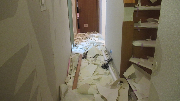 台所と1階~3階までの既存クロスの剥がし作業。夜8時くらいまで頑張ってくれましたが、素人作業で以前汚れた壁紙の上から2重貼りした部分の剥がし作業が困難を極め3階の一部は完了できませんでした。