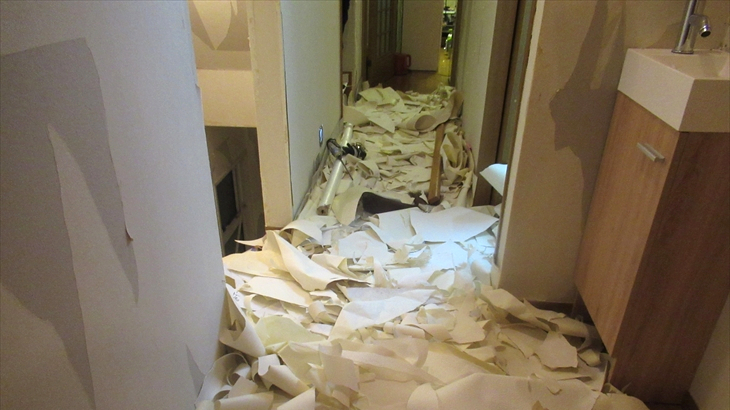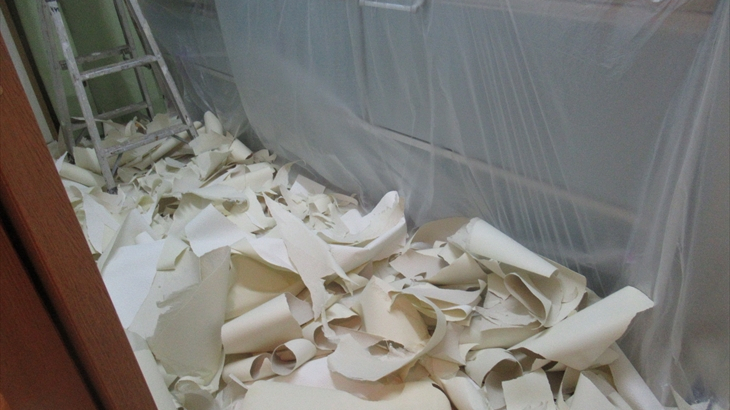 既存クロスの剥がし状況が想定していたより悪いようで本日の作業は中止。