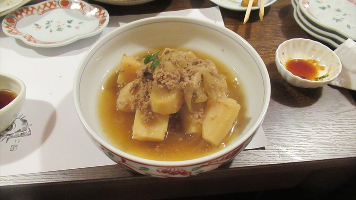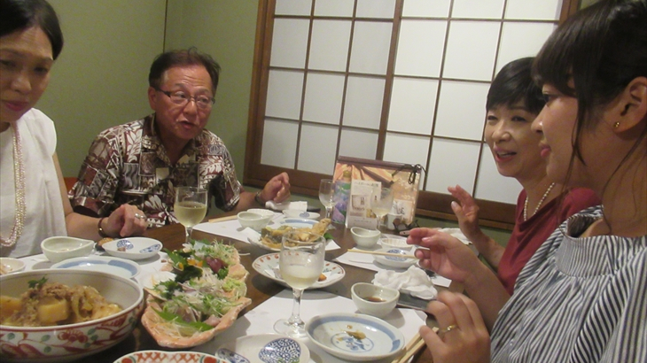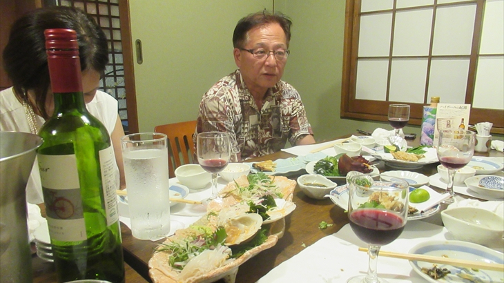 全員集合してまた乾杯♪♪~。金目の煮つけ(3)、カボチャの揚げ物(1)、ポテトフライ(ガーリック味:1)、おむすびセット(2)、カレイの唐揚げ(3)、大盛り肉じゃが(2)、うなぎの白焼き(3)を頂きながらワイワイガヤガヤ。ここまでのお料理は事前にお願いしていたものです。