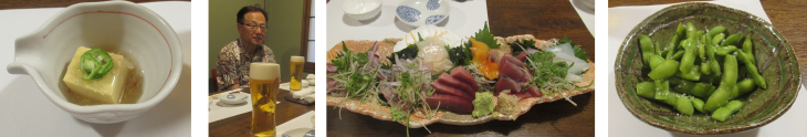 18時30分定刻から4名で始まりました。お通し、茶豆風の枝豆(3)、お刺身の盛り合わせ(2)にてビールで乾杯♪♪~