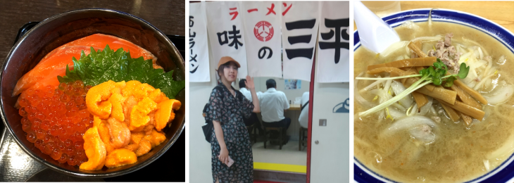 ホテルの朝食をパスして朝市で長女が楽しみにしていた観光地値段(3000円)の三色丼(イクラ・うに・サーモン)を頂き、お土産などを購入、お昼ご飯は味噌ラーメンで有名な三平。