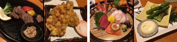 サッポロビール苑・博物館の見学、夕方になり長女と合流しました。夕食は北海道の名産が頂けるお店で、お刺身・茹でアスパラ・ステーキ・トウモロコシのかき揚げなどを美味しく頂きました。
