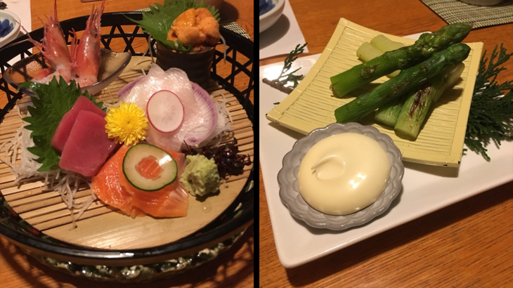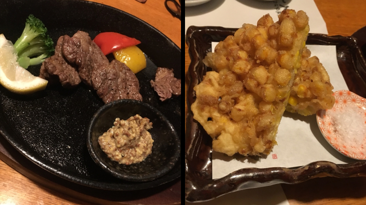 サッポロビール苑・博物館の見学、夕方になり長女と合流しました。夕食は北海道の名産が頂けるお店で、お刺身・茹でアスパラ・ステーキ・トウモロコシのかき揚げなどを美味しく頂きました。