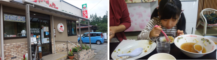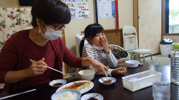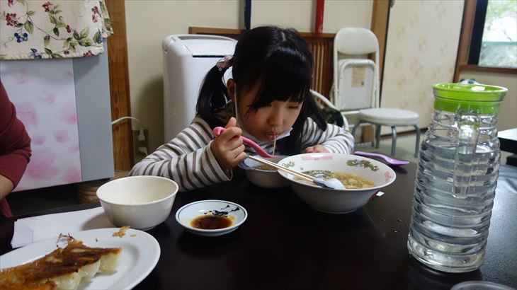 ミニらーめん2つ、餃子1人前、味噌ラーメンセット(餃子4個と小ライス付)を注文。文ちゃんが一気にラーメン完食、餃子も2個食べました。