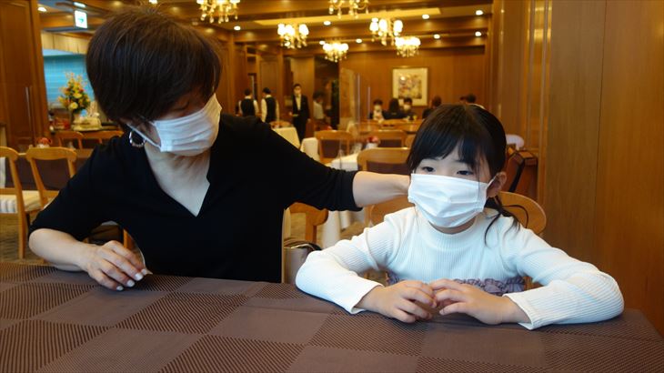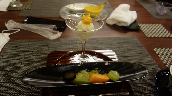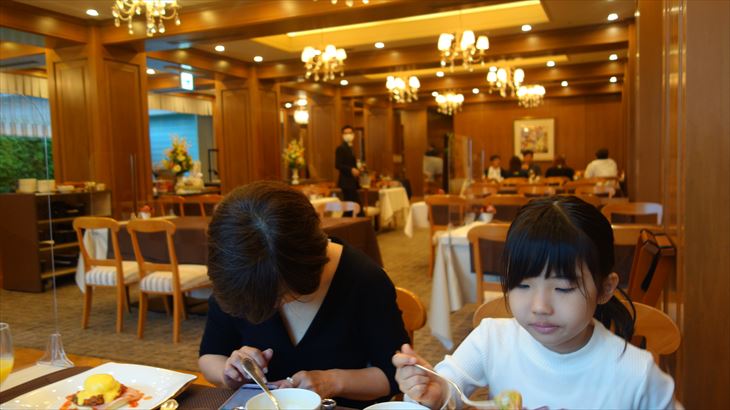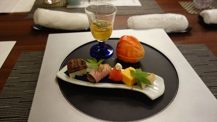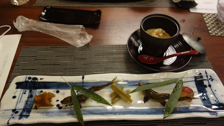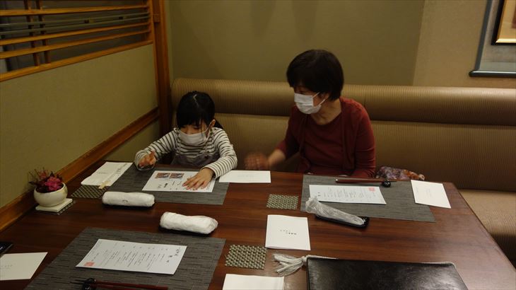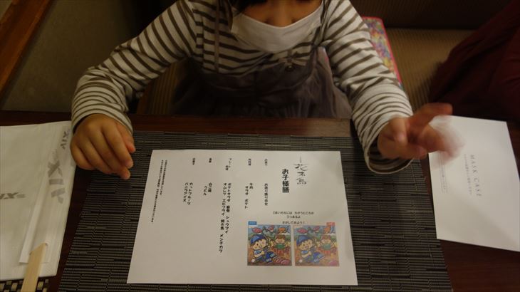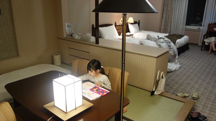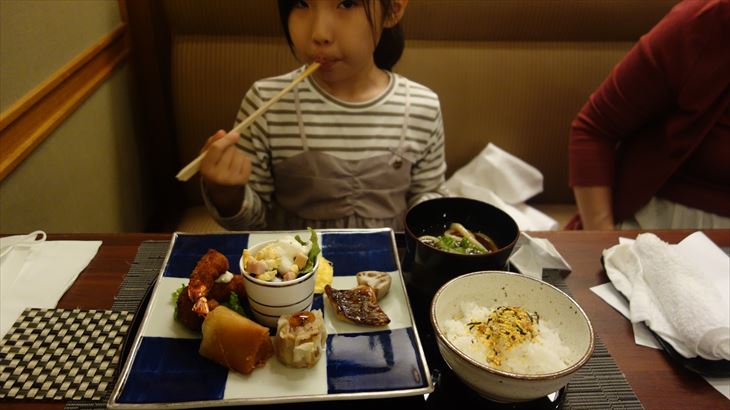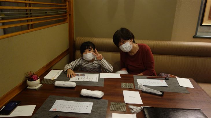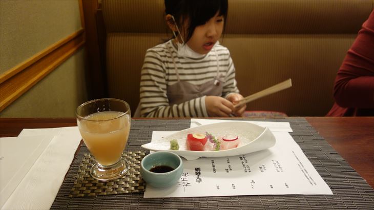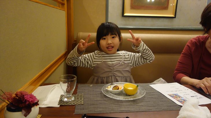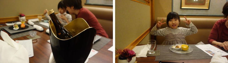 夕食は和食、この時期は1食分無料になるので9000円のコース、子供用のお食事のお品書きもありました。冷酒のボトルをお願いしてゆっくり・楽しく過ごしました。文ちゃんがお昼寝しなかったのが心配でしたが、ここでも一気に完食、とっても元気でした。