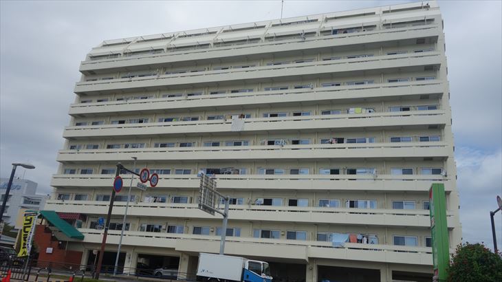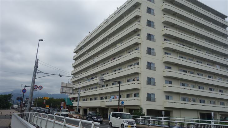 リゾートマンションがある場所は限られているので、普通の中古マンションで検索して候補になったのが小田原と三浦海岸の中古マンション。小田原駅の一つ手前の鴨宮駅から徒歩19分で国道1号線沿い、400万円、1DK(47.95平米)、築46年のサンハイツ小田原を外観見学ました。