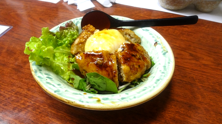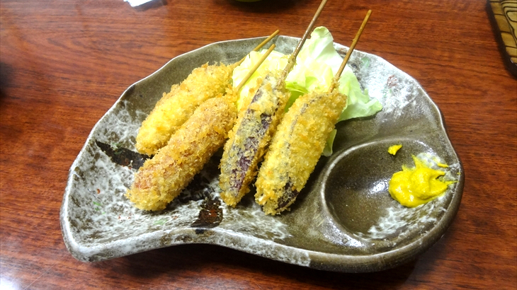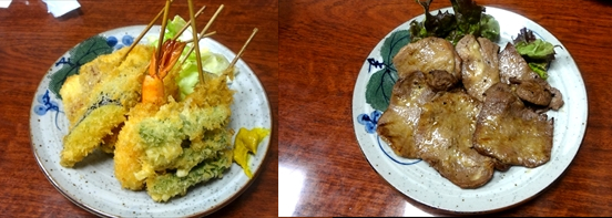 第1段として、つくね焼き温玉添え(600円)、とり団子のポン酢和え(550円)、串揚げの盛り合わせ2人前(800円×2)、ウインナーとポテトの串揚げを追加、牛たん焼き(830円)、おにぎり(2個で450円)を注文。