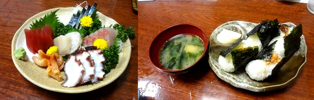 だいぶ頂いたと思いますが、お料理注文第3段(最終)は、お刺身お得盛り合わせ(3000円)、おにぎり2人前(450円×2)、海藻サラダ(500円)、餅のおろし揚げ(450円)、ちくわの磯部揚げ(420円)です。