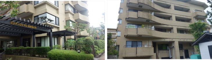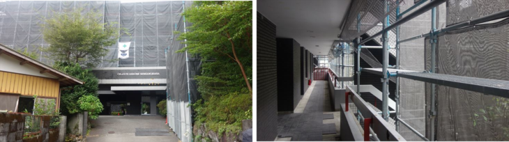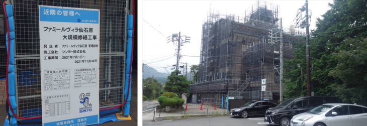 ローソンの駐車場に車を止め、隣のファミール・ヴィラ仙石原(1982年に建設と最も古い:480万円)を見学、ここも大規模修繕中(7月~11月)でした。頑張ってるという感じでした。