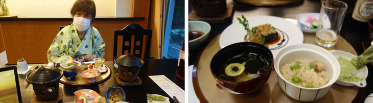 神奈川県の緊急事態宣言でお酒類は飲めないので、夕食前にお部屋でビール・ワイン・日本酒などを飲んでから食堂にくりだしました。我々の他、お客様は数組、1時間ちょっとのスピード夕食でしたが、サービスも良く美味しかったので満足しました。