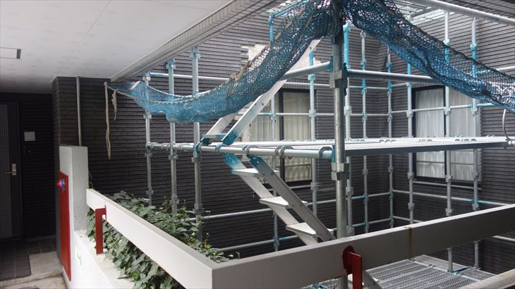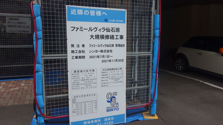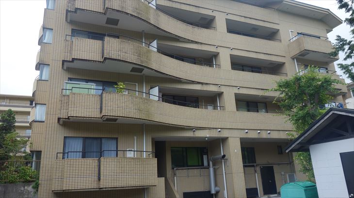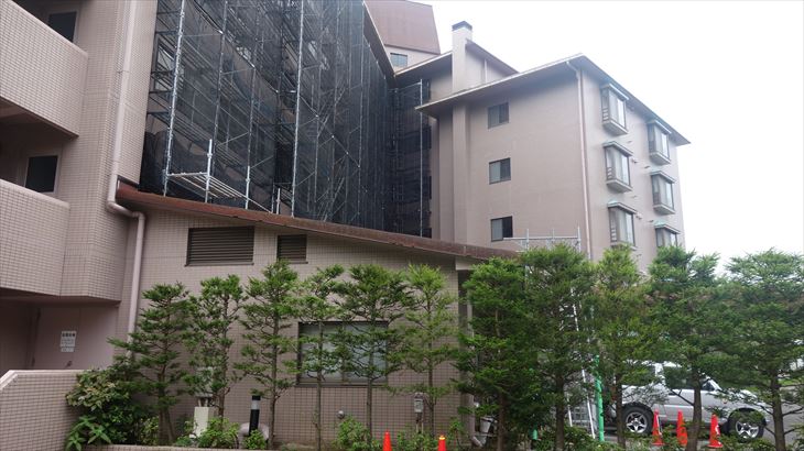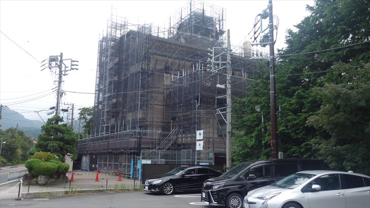 ローソンの駐車場に車を止め、隣のファミール・ヴィラ仙石原(1982年に建設と最も古い:480万円)を見学、ここも大規模修繕中(7月~11月)でした。頑張ってるという感じでした。