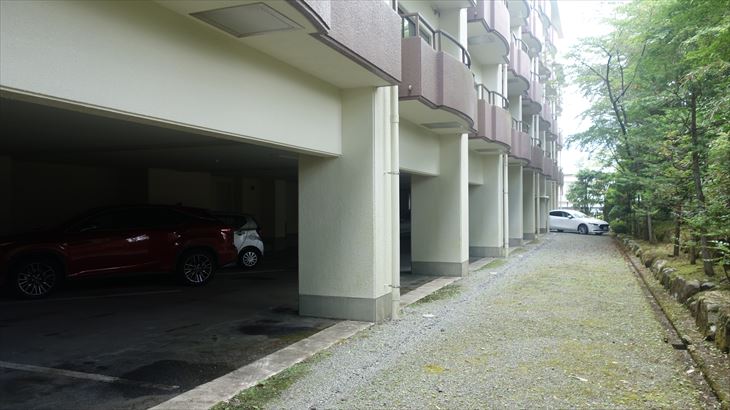 次に向かったのはメイン通りに面した車用エントランスのあるファミール・ヴィラ第四仙石原(480万円)、Aコープから徒歩10分。駐車場はピロティ式、ファミール・ヴィラの外観は1~4までほとんど同じです。