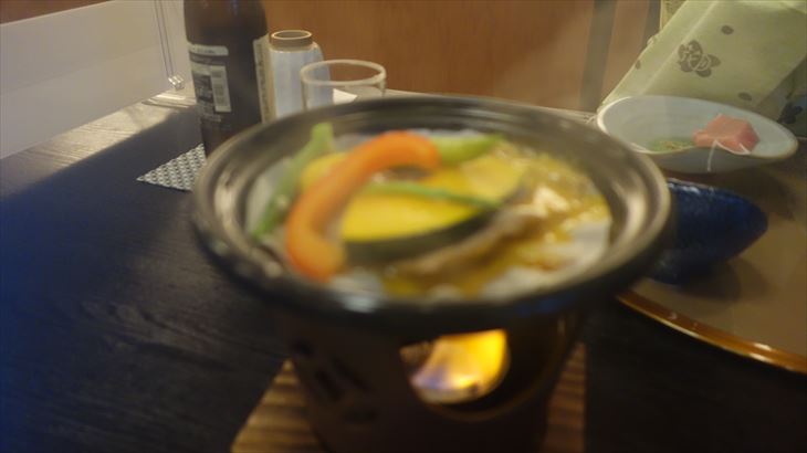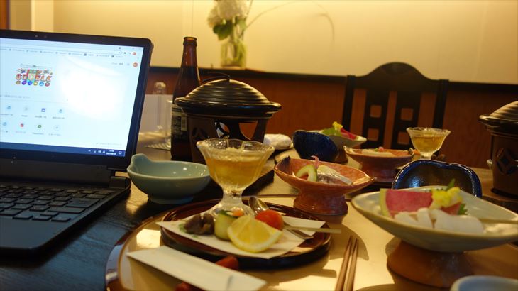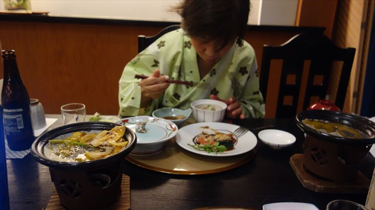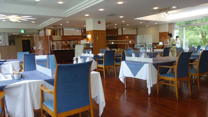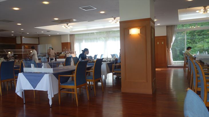 神奈川県の緊急事態宣言でお酒類は飲めないので、夕食前にお部屋でビール・ワイン・日本酒などを飲んでから食堂にくりだしました。我々の他、お客様は数組、1時間ちょっとのスピード夕食でしたが、サービスも良く美味しかったので満足しました。