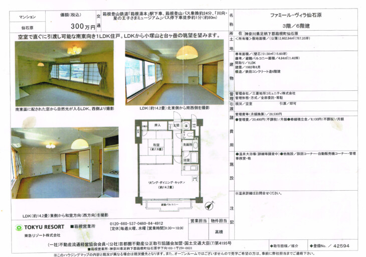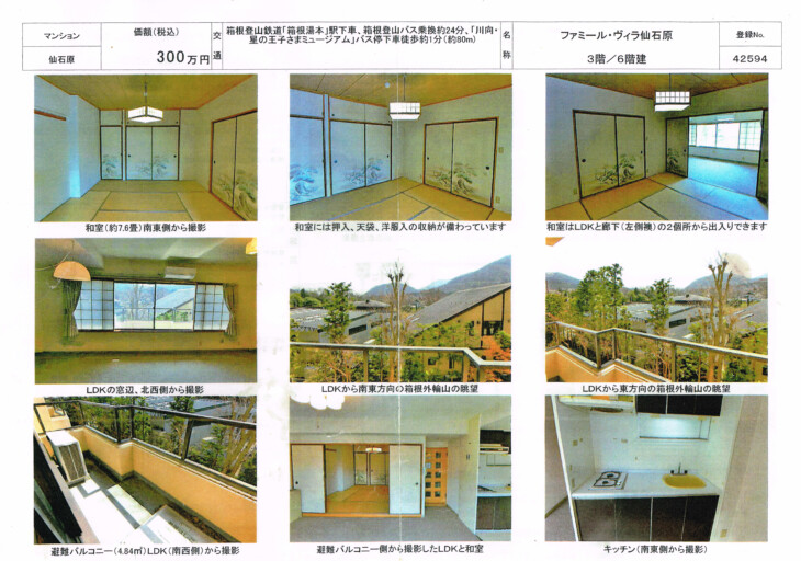 9月9日に東急リゾートの黒澤さんの計らいで(東急リゾートは500万円以下の物件は公開しない)見学した物件。3階なので眺望は望めませんが、法人所有で残置物もほとんどなく綺麗、300万円の超破格。