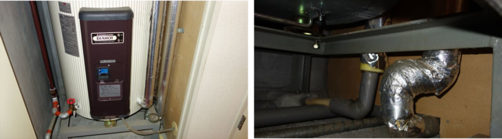 セルフスケルトンリノベーションで最初に立ちはだかったのはガス給湯器NG。この物件は玄関横のスペースにとても大きな貯蔵式給湯器(DAIHOT)を設置した古い給湯システム。寒冷地対策の床暖房の導入にあたり、初期費用が安くスペース有効利用ができるガス給湯器の導入を検討しました。
