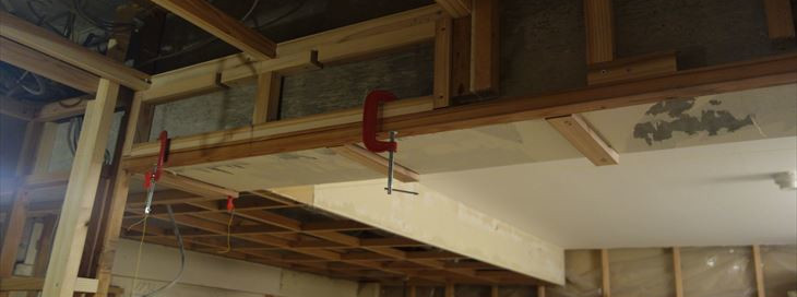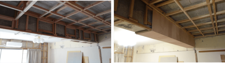 梁の和室側と梁下に板貼り付けるラワン合板の下地作業。タチカワブラインド用の下地ラワン合板の幅寸法348mmに決定。高さ調整とさらなる補強を行い合板取付を明日行いたい。